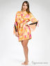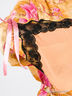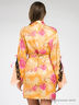 Привлекательное кимоно выполнено из струящегося натурального шелка с ярким цветочным принтом. Модель с запахом, без карманов и внутренних завязок. Съемный внешний пояс продет в шлевки. Рукава декорированы однотонными вставками персикового цвета, черным кружевом и розовыми бантиками с лентами.