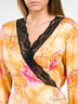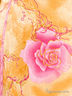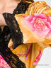 Соблазнительное кимоно из натурального шелка с ярким принтом. Модель с розовыми завязками спереди по линии талии. Полочка, спинка и рукава декорированы черным кружевом и розовой тесьмой.
