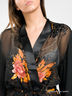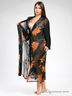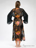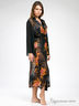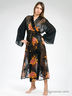 Элегантный халат из комбинированного шелка с ярким цветочным принтом. Модель с запахом, без карманов. Внешний съемный пояс продет в шлевки и дополнен внутренними завязками.