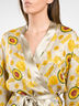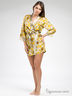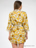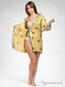 Привлекательное кимоно выполнено из струящегося натурального шелка с ярким принтом. Модель с запахом, без карманов. Внешний съемный пояс выполнен из однотонного шелка, продет в шлевки и дополнен внутренними завязками. Укороченные рукава декорированы изящным кружевом.