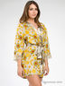 Привлекательное кимоно выполнено из струящегося натурального шелка с ярким принтом. Модель с запахом, без карманов. Внешний съемный пояс выполнен из однотонного шелка, продет в шлевки и дополнен внутренними завязками. Укороченные рукава декорированы изящным кружевом.