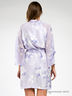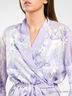 Изящное кимоно из натурального шелка с принтом. Рукава, воротник и пояс выполнены из матового, более тонкого шелка. Модель с запахом, без карманов. Внешний съемный пояс продет в шлевки и дополнен внутренними завязками. Края рукавов обработаны оверлочным швом, благодаря чему манжета схожа с воланом. Рукава декорированы шелковыми розочками.