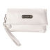 Клатч, состоящий из одного отделения на молнии, содержащий один карман внутри, декоративные элементы в виде клапана на магнитиках, под клапаном кармашек на кнопочке, с задней стороны карман на молнии. Подкладка темно-серый полиэстер, фурнитура золото.
