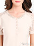 Детали: круглый вырез; короткий цельнокроеный рукав с отворотом; застегивается на пуговицы спереди; декорировано вставками из шифона на рукавах и пришивными стразами