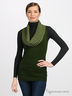 Мягкая трикотажная кофта без рукавов, мелкой вязки, слегка приталенного кроя. Широкий ворот-хомут выполнен в рубчик с добавлением пушистой нити. Низ изделия дополнен высокой трикотажной резинкой в рубчик.