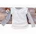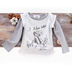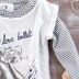 Основа изделия с длинным рукавом выполнена из тонкой трикотажной ткани в полоску. Округлый вырез горловины. Сверху маечка белого цвета с принтом.