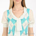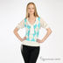 Силуэт приталенный. Короткий рукав-фонарик из тонкой шифоновой ткани, широкая манжета-резинка. Округлый вырез горловины декорирован манишкой из белого шифона, который можно завязать в бант. Низ кофты "посажен" на широкую манжету-резинку.