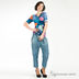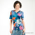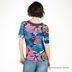 Яркая разноцветная кофта необычного кроя. Короткие рукава с манжетой. V-образный вырез ворота. Часть ворота отделана трикотажной резинкой. Декоративные металлические элементы на вороте.