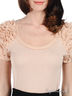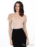 Детали: округлый вырез горловины, короткие рукава, плечи декорированы оборками с бусинами, сзади глубокий вырез, завязывается на ленту