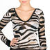 Стильная кофта с принтом, имитирующим зебру, с длинными рукавами и V-образным вырезом горловины, украшенным атласной тесьмой и бантиком из атласной ленты. Спинка имеет соблазнительный V-образный вырез, украшенный атласной тесьмой.
