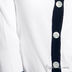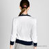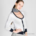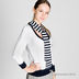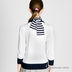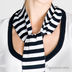 Эффектная кофта из трикотажа контрастного цвета, дополненная кокетливым шарфиком. Округлый вырез горловины окантован контрастным черным трикотажем, в том ему оформлены манжеты на рукавах и широкая резинка по низу кофты. Рукав длиной 3/4, присборен по линии плеча. Застежка на белые перламутровые пуговицы. Трикотажный шарфик в полоску прекрасно дополняет кофточку и придает образу нотку кокетливости.