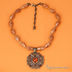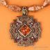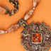 Колье в средневековом стиле из состаренного металла под бронзу с оранжевыми кристаллами, в виде креста с оранжевым кристаллом на ожерелье из коричневых камней. Составляет комплект с артикулами В1112 и R1042.