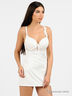 Потрясающая комбинация выполнена из тонкой эластичной гладкой ткани. Чашки на косточках дополнены несъемным поролоновым уплотнителем с эффектом push-up. Регулируемые эластичные бретели-трансформеры, с возможностью застежки вокруг шеи. Верх изделия застегивается сзади на два крючка в три позиции. Декорирована сетчатой вставкой с вышивкой.