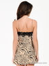 Оригинальная комбинация из натурального шелка с жаккардовым плетением. Тонкие бретели регулируются по длине. Верх изделия дополнен кружевной окантовкой. Декорирована оригинальным принтом, сбоку разрез с бантиком.