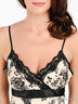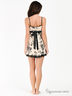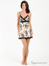 Оригинальная комбинация из натурального шелка с жаккардовым плетением. Тонкие бретели регулируются по длине. Под грудью пристроченный атласный поясок. Лиф анатомического кроя. Изделие декорировано оригинальным принтом и кружевными вставками.