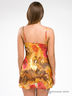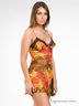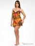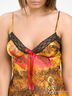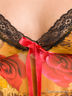 Изящная сорочка из тонкого натурального шелка с пестрым принтом. Бретели регулируются по длине. V-образный вырез украшен крупным бантиком с лентами красного цвета. Лиф и боковой разрез снизу декорированы кружевом.