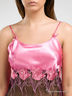 Изящная сорочка на тонких регулируемых бретелях. Полочка декорирована широкой вставкой из тонкой сеточки с шитьем и атласными бантиками. Внизу сбоку небольшой разрез.