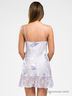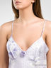 Изящная сорочка на тонких регулируемых бретелях из натурального шелка с цветочным принтом. V-образный вырез. Расклешенный силуэт. Лиф с декоративными складками и розочкой из шелка. Подол отделан широкой оборкой из матового шелка с принтом.