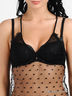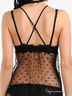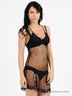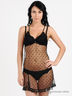 Оригинальная комбинация из тонкой сетчатой ткани. Отрезной лиф посажен на резинку, сзади застежка - крючок. Тонкие эластичные бретели перекрещиваются на спине, регулируются по длине. Декорирована кружевной окантовкой.