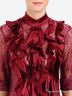 Детали: воротник стойка, застежка на кнопках, декор многоярусной рюшей, короткие рукава с отворотом, шлевки под пояс и пояс из отделочной ткани в комплекте, лицевая сторона выполнена вязанной тканью, что придает изделию особого шарма? отрезной по линии талии, два открытых кармашка, брючины расклешенные.