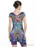 Оригинальный яркий комбинезон приталенного кроя. Выполнен из гладкой эластичной ткани, короткие рукава, округлый вырез, талия подчеркнута поясом в тон. Низ и верхняя часть украшены кружевом, сзади застегивается на молнию.