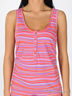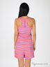Трикотажный женский комбинозон. Глубокая круглая горловина. Спинка борцовка. Спереди планка застежка на пуговицах. Заниженная талия с кулиской. Два кармана спереди.