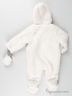 Комбинезон прямого силуэта с капюшоном. Хлопковый подклад, утеплен синтепоном. Съемные варежки, несъемные ботиночки. Застежка на кнопки от ворота до низа брючины. Полочка украшена нашивкой.