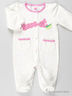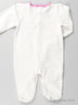 Трикотажный комбинезон с округлым вырезом горловины и длинным рукавом застегивается на кнопки от выреза горловины, застежка расходится в две стороны по шаговому шву и спускается до формованной стопы. Два передних кармашка. Полочка украшена нашивками.