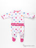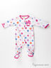 Флисовый комбинезон с округлым вырезом горловины и длинным рукавом застегивается на кнопки от выреза горловины, застежка расходится в две стороны по шаговому шву и спускается до формованной стопы с трикотажной вставкой. Полочка украшена нашивкой. Задняя часть декорирована рюшами. Изделие украшено рисунками.