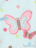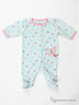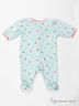 Махровый комбинезон с округлым вырезом горловины и длинным рукавом застегивается на кнопки от выреза горловины, застежка расходится в две стороны по шаговому шву и спускается до формованной стопы, украшенной атласным бантиком. Полочка украшена нашивкой. Изделие декорировано рисунками.