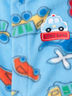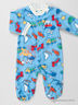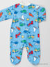 Флисовый комбинезон с округлым вырезом горловины и длинным рукавом застегивается на кнопки от выреза горловины, застежка расходится в две стороны по шаговому шву и спускается до формованной стопы. Полочка украшена нашивками и вышивкой. Изделие декорировано рисунками.