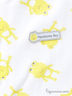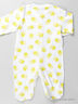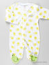Трикотажный комбинезон с округлым вырезом горловины и длинным рукавом застегивается на кнопки от выреза горловины, застежка расходится в две стороны по шаговому шву и спускается до формованной стопы, выполненной в виде мордочки лягушки. Изделие украшено рисунками.