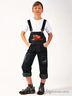 Модель прямого кроя на лямках. Лямки на комбинезонных застежках. Имитация застежки на молнию. Множество карманов. К поясу пришиты шлевки. Декоративная аппликация на полочке.