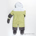Комбинезон прямого кроя с капюшоном застегивается на две параллельные молнии и две кнопки. В край капюшона вставлена резинка. Хлопковый подклад. Внутренняя трикотажная манжета-резинка в рукавах. Внутренняя брючная манжета с резинкой. Имитация нагрудного кармана. Присбаривающая резинка на спинке. Полочка украшена аппликацией. В комплекте идут варежки с липучкой, которые пристегиваются к внутренней стороне рукавов на резинку с кнопкой. Также в комплекте мягкие "ботиночки", пристегивающиеся к внутренней стороне брючин на кнопки.