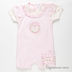 Комбинезон прямого силуэта с коротким рукавом. Застежка на четыре кнопки на спинке, застежка на кнопки в шаговом шве. Изделие украшено оборками, рюшами, нашивкой и вышивкой.