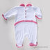 Комбинезон для девочки, круглый воротник, оборочки по низу рукава, штанины и кокетки на спинке. Сзади застегивается на 4 пуговицы и на кнопки по шаговому шву.