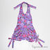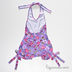 Комбинезон с открытой спиной, перед фиксируется завязками на шее, Штанины декорированы накладными карманами со складками. Низ штанины собран на манжету, с декоративными бантами. Сзади в спинку вставленна резинка.