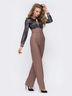 Нарядный комбинезон с лифом из тонкой глитерной ткани, расшитой пайетками. Модель с отложным воротником и разрезом в зоне декольте. Застёгивается на молнию и пуговицу по спинке. Станет идеальным вариантом для обладательниц типа фигуры «прямоугольник», «песочные часы».