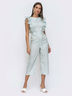 Летний комбинезон в полоску с рюшами на полочке. Изделие застегивается на молнию и пуговицу сзади. Вертикальная полоска визуально вытягивает силуэт. Отлично сочетается с обувью на низком ходу и каблуке.