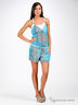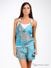 Короткий коибинезон из легкой лоснящейся ткани. Лиф-двойка - маечка из прияного на ощупь эластичного материала с регулируемыми бретельками и лиф с V-образным вырезом с бретельками канатами на карабинах. Линия отреза пояса и талия посажены на многорядную резинку. Два втачных кармана. Есть шлевки для ремня. Брючины с отворотами.