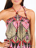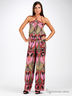 Комбинезон свободного покроя из струящегося, шелковистого материала. Тонкие бретельки завязываются на шее. Верх спинки и пояс посажены на многорядную резинку. Талия подчеркнута широким поясом в цвет изделия. Расклешенные брюки.