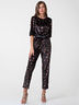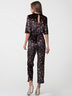Комбинезон из мокрого бархата прилегающего силуэта. Детали: горловина округлой формы, втачной рукав до локтя с манжетом по низу, резинка по талии, брючные карманы, по спинке - разрез и застежка на петлю и пуговицу.