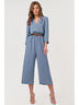 Особенности: Комбинезон полуприлегающего силуэта из костюмной ткани. Детали: V-образный вырез с запахом по переду, сборка на эластичную ленту по талии, завышенная линия плеча, втачной рукав со сборкой по окату, прямые брюки. Без застежки.
