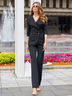 Стильный брючный комбинезон, сочетает в себе строгость классики, изысканность и женственность. На модели отложной воротник, рукав до локтя, брюки прямого кроя с двумя прорезными карманами по бокам.