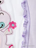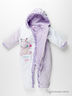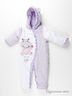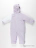 Утепленный синтепоном велюровый комбинезон с капюшоном, украшенным пришитыми ушками, и длинным рукавом застегивается на кнопки от выреза горловины, застежка расходится в две стороны по шаговому шву и спускается до низа брючин. Хлопковый подклад. Полочка украшена нашивками и вышивкой. Край капюшона, планки застежки и манжеты украшены оборкой.