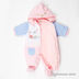Детали: отстегивающийся капюшон с мордочкой и ушками, застежка на кнопки от выреза горловины до манжет брючин, "ботиночки" отстегиваются, маленький передний кармашек, декоративные нашивки и вышивка