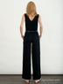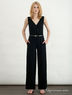 Стильный комбинезон из качественного вискозного материала. V-образный вырез горловины с запахом. Спереди два прорезных кармана. Длинные прямые брючины. Модель дополнена шлевками для ремня.