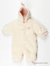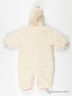 Комбинезон с капюшоном и длинным рукавом выполнен из искусственного меха, с синтепоновым утеплителем и хлопковым подкладом. Рукава и брючины посажены на трикотажные манжеты. Полочка декорирована нашивкой.