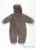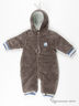 Комбинезон с капюшоном и длинным рукавом выполнен из искусственного меха, с синтепоновым утеплителем и хлопковым подкладом. Рукава и брючины посажены на трикотажные манжеты. Полочка декорирована нашивкой.