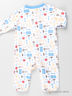 Трикотажный комбинезон с округлым вырезом горловины и длинным рукавом застегивается на кнопки от выреза горловины, застежка расходится в две стороны по шаговому шву и спускается до формованной стопы. Изделие украшено рисунками.